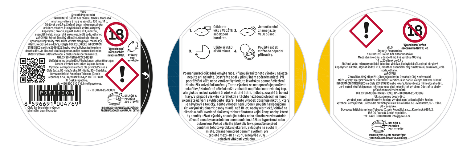 Nikotinové sáčky VELO představují moderní způsob užívání nikotinu. Neobsahují žádný tabák, méně barví zuby* a jsou bez zápachu a kouře**. VELO můžeš užívat kdekoliv a kdykoliv: v MHD, kanceláři i v letadle. Na výběr máš z mnoha různých příchutí v různých intenzitách. Stačí si jen vybrat tu svou.
